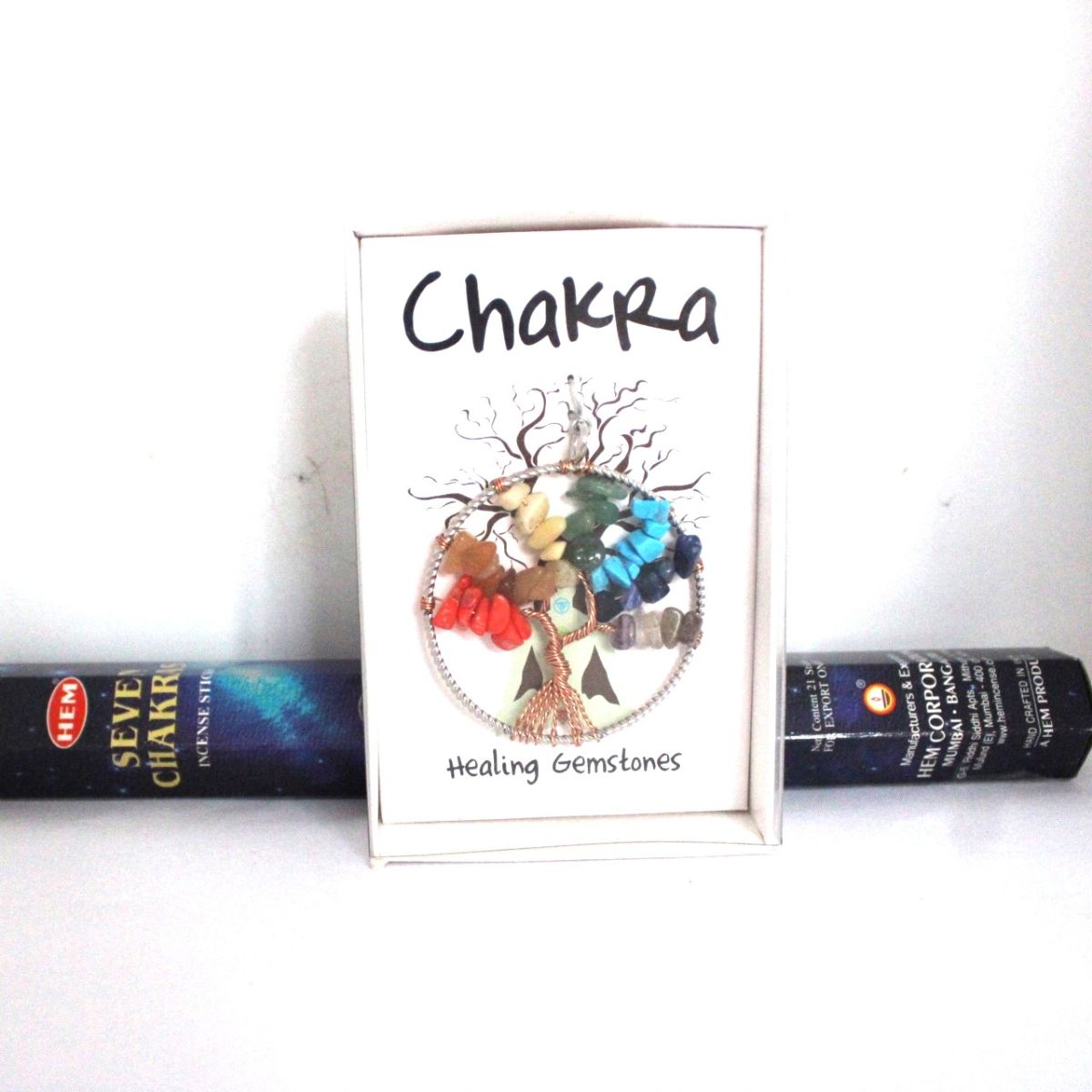 * een mooie hanger met de levensboom en de 7 chakra stenen erin verwerkt. U ontvangt de hanger met de ketting. Hij kan door U zelf gedragen worden of voor het raam gehangen worden.