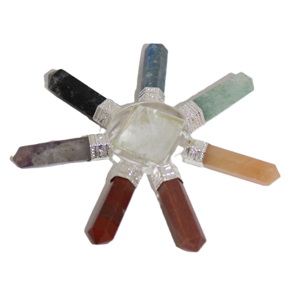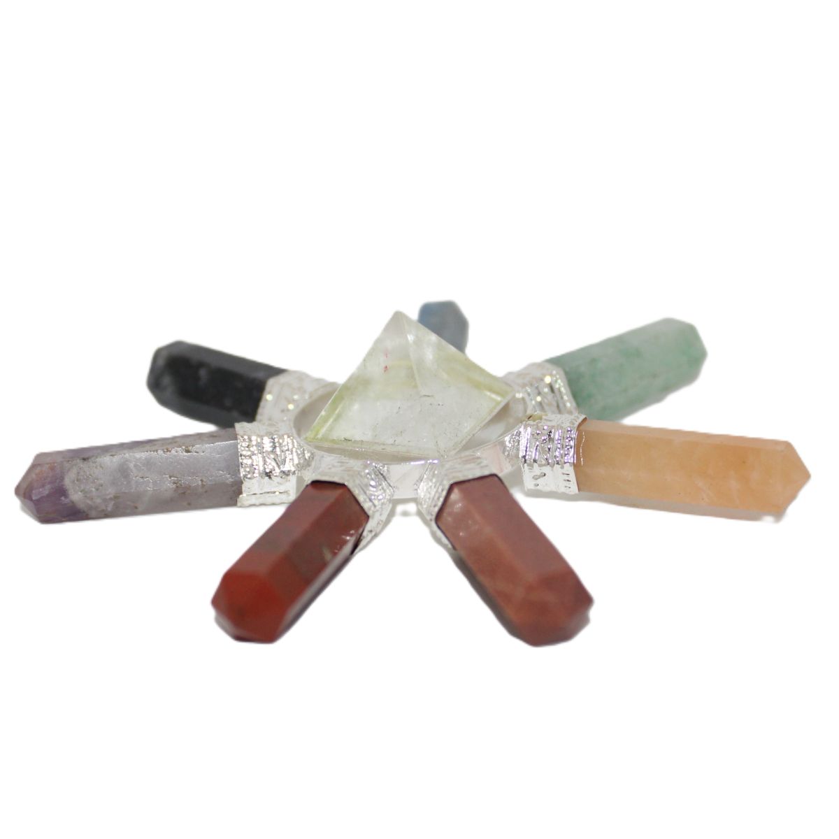 Deze generator is gemaakt van 7 pendels van edelstenen in de Chakra kleuren met een heldere Bergkristal piramide in het midden.