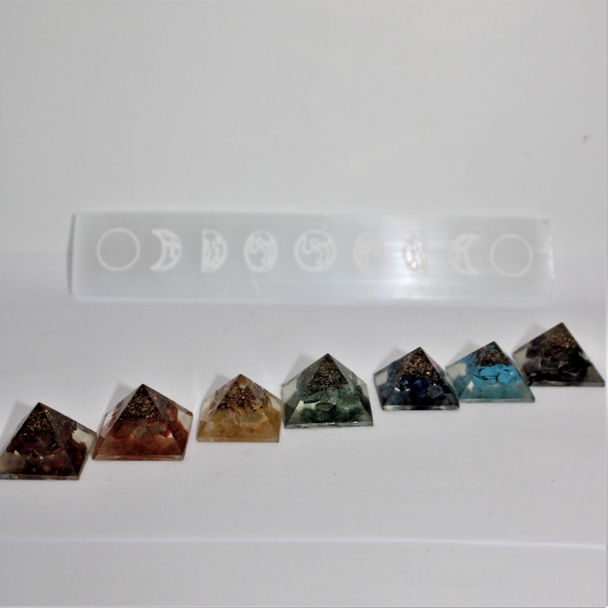 Chakra priamide set met Seleniet Maan schijf