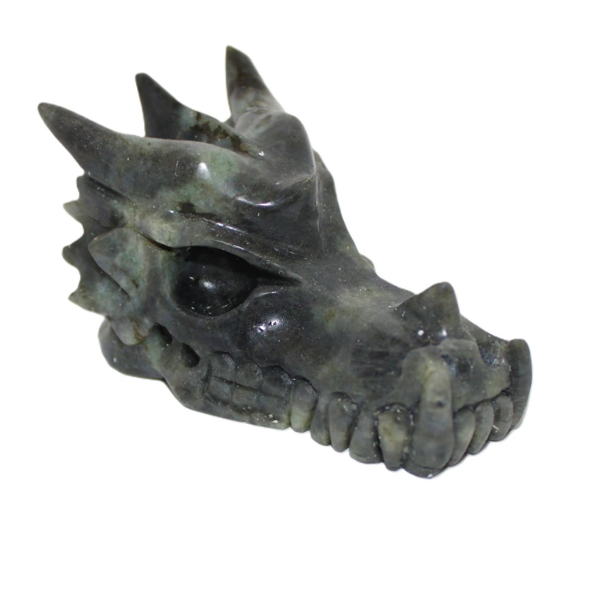 Unieke drakenschedel van Labradoriet van ongeveer 8 x 4,5 x 4,5 cm.