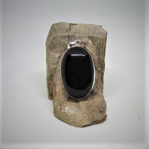 Onyx hanger omvat in Indiaas zilver van ongeveer 4 cm lang.