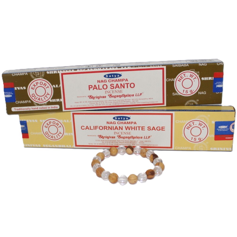 * een armband op elastiek van Bergkristal en palo santo kralen