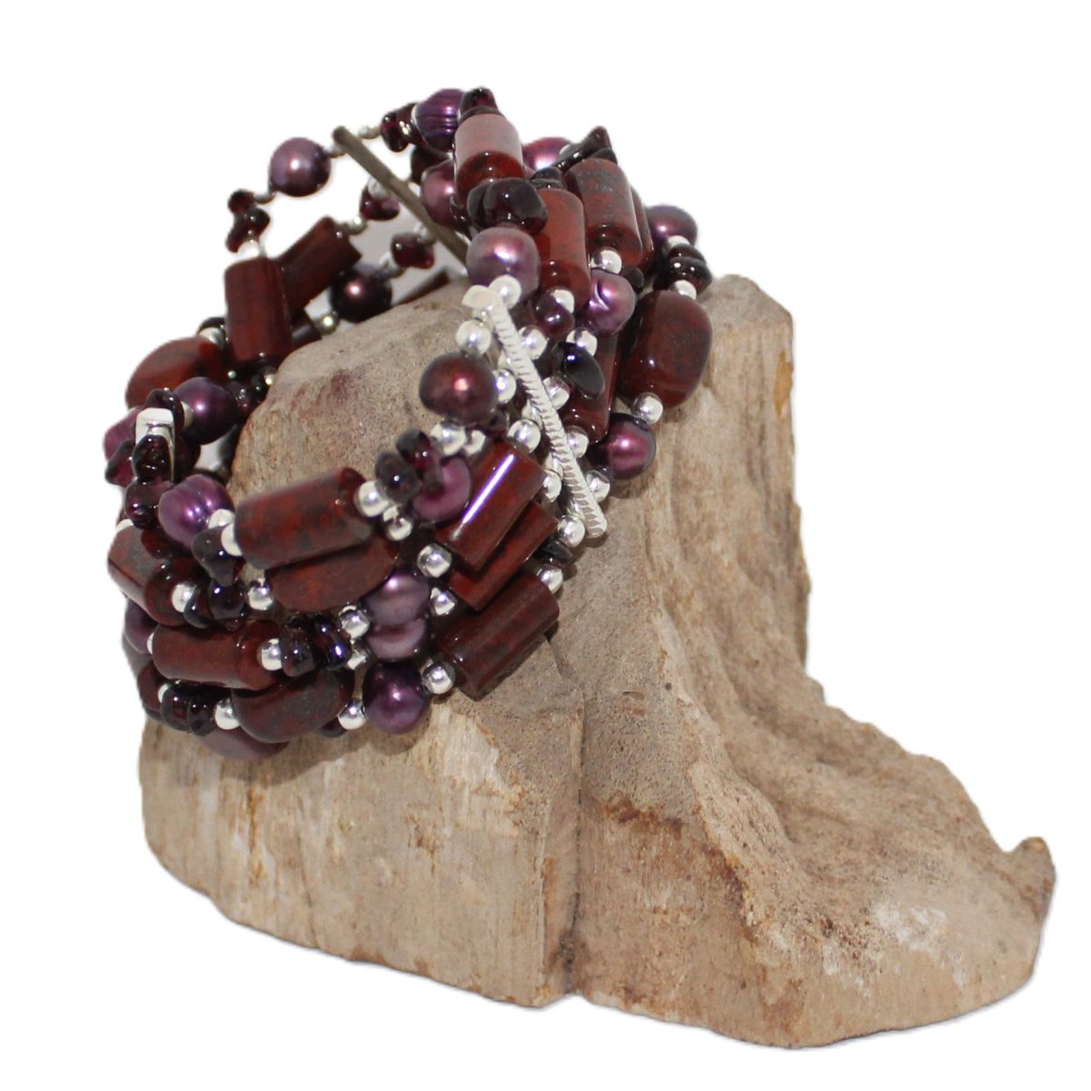 Uit onze Zomer Collectie is deze armband gemaakt van Mahonie Obsidiaan split steentjes met gecultiveerde bijgekleurde parels.